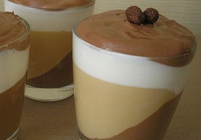Нагибаем стакан и заполняем его (предположительно 2 столовые ложки) сметаной с шоколадом. Далее выкладываем сметану со сгущенкой и крайним покровом сметану с сахаром. Покрываем сверху узким покровом сметаны с шоколадом.