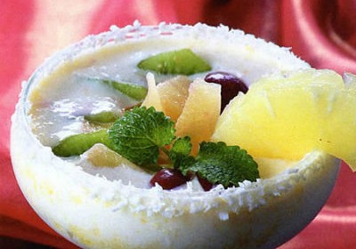 Заполняем данной для нас консистенцией бокалы, скрашиваем дольками плодов. Посыпаем кокосовой стружкой.