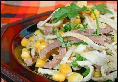 Все ингредиенты мешаем, прибавляем 1 банку консервированной кукурузы и заправляем майонезом.
