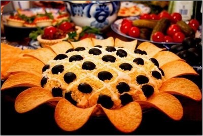 Иной раз настанет время подавать салат к столу, скрашиваем его по краям чипсами, в внешности лепестков подсолнуха.