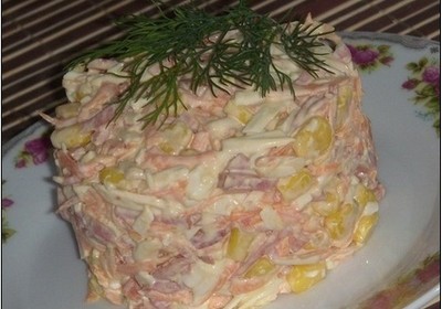 Перемешиваем все ингредиенты, морковь, сыр, колбасу, консервированную кукурузу, чеснок, майонез. Солим и перчим салат по вкусу. Все кропотливо размешиваем и скрашиваем зеленью.