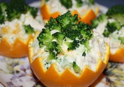 Приобретенную массу выложите в кожуру апельсинов и украсьте брокколи.