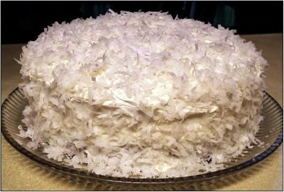 Вершина тортика и бока смазываем кремом и посыпаем кокосовой стружкой.