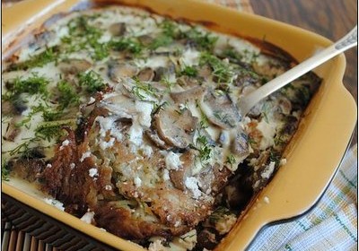 Выкладываем на смазанный маслом противень оболочка драников, на их возлагаем порезанный на пластинки чеснок, оболочка грибов, опять оболочка драников, пластинки чеснока и опять оболочка грибов, сверху заливаем сметаной и ставим в разогретую до 200 градусов духовку, запекаем 30 минут.