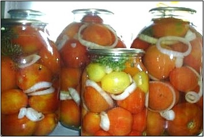 Выкладываем покровами в банку помидоры перекладывая их луком. На одну банку половина луковицы.